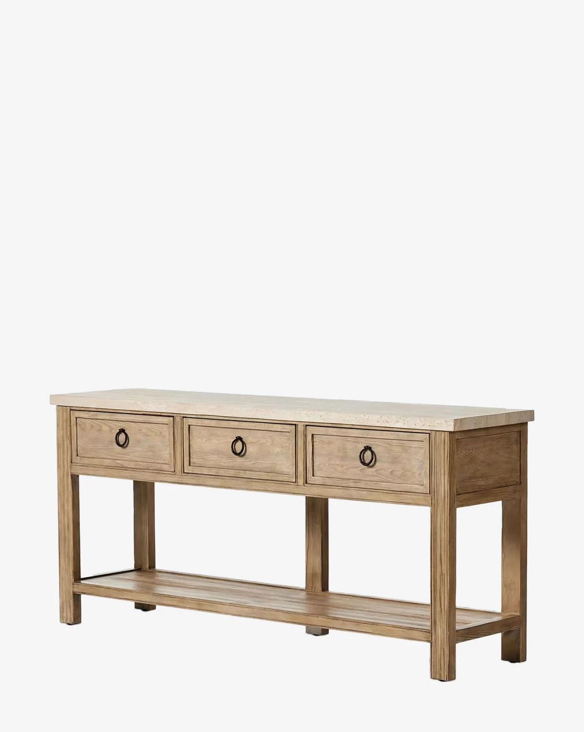 Designed with traditional roots, the Tillie Console is made with an ash gray wood base and a solid travertine top. This bold mix of materials brings interest and texture to your styling from the entryway to the living room.