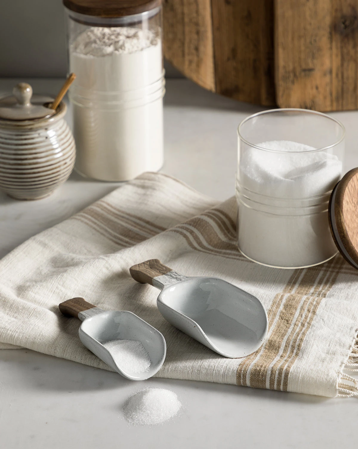 A beautiful display of contrast, the Two-tone Porcelain Scoop combines speckled white porcelain scoops with neutral, beige handles. With subtle detailing on the handles and a design focused on form, this set of scoops is a playful spin on a romantic style that gives your space a charming feel.