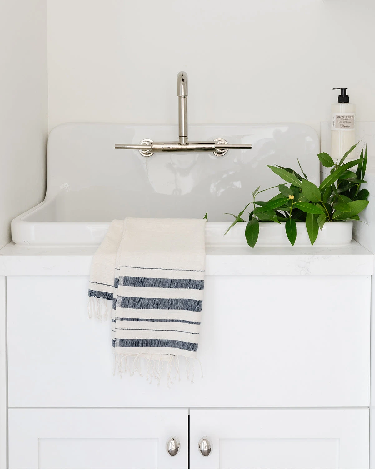 The Upton Stripe Hand Towel represents modern design created through natural production.  Its contemporary navy and white stripe pattern comes from locally sourced Ethiopian cotton and eco-friendly dye that’s been entirely handcrafted from native artisans under fair trade practices.