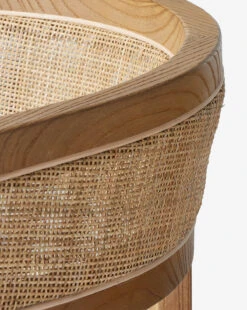 The Valissa Armchairs modern design holds a neutral upholstered seat and a cane barrel seatback. The mixed materials provide a sophisticated sense of comfort, while the inviting frame brings a unique element to your dining room styling.