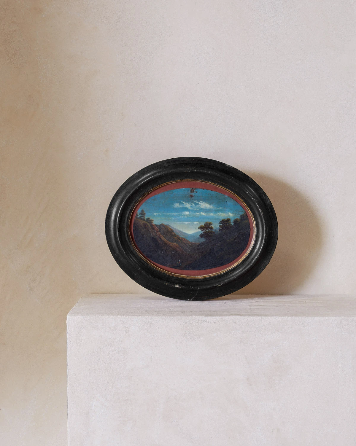 Featuring a unique rounded frame, this vintage painting makes the most of its petite mountain scene, drawing the eye in with its crisp blue skies and moody hued mountains. Styled in built-ins or as part of a larger gallery wall, this piece effortlessly lends character to your space.