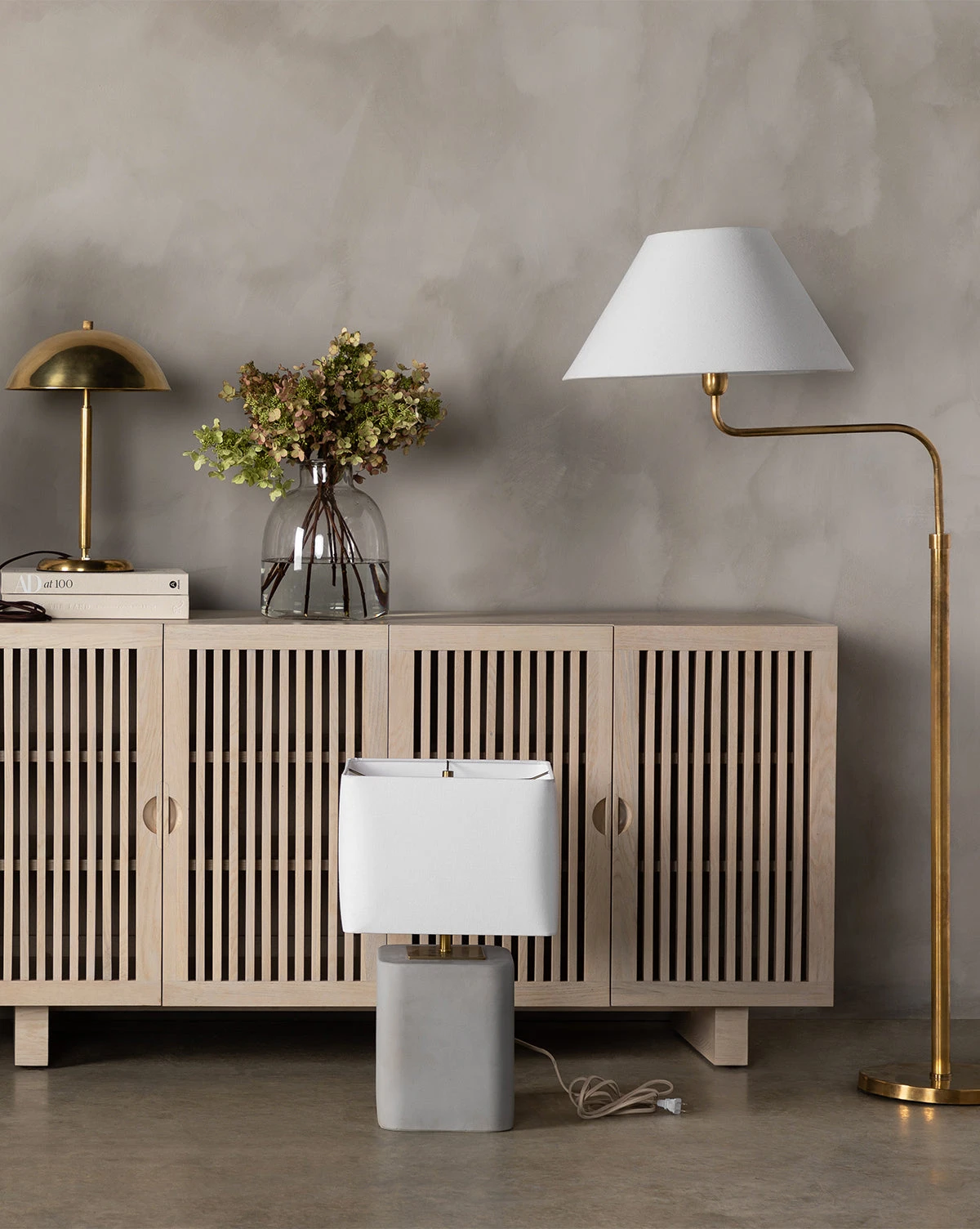 With a pronounced bend in its structure, the Wainwright Swoop Floor Lamp brings intrigue to a space while it elegantly illuminates. The brass body gives the floor lamp a vintage feel, while the simple linen shade allows you to style the lamp with your decor anywhere it is placed.