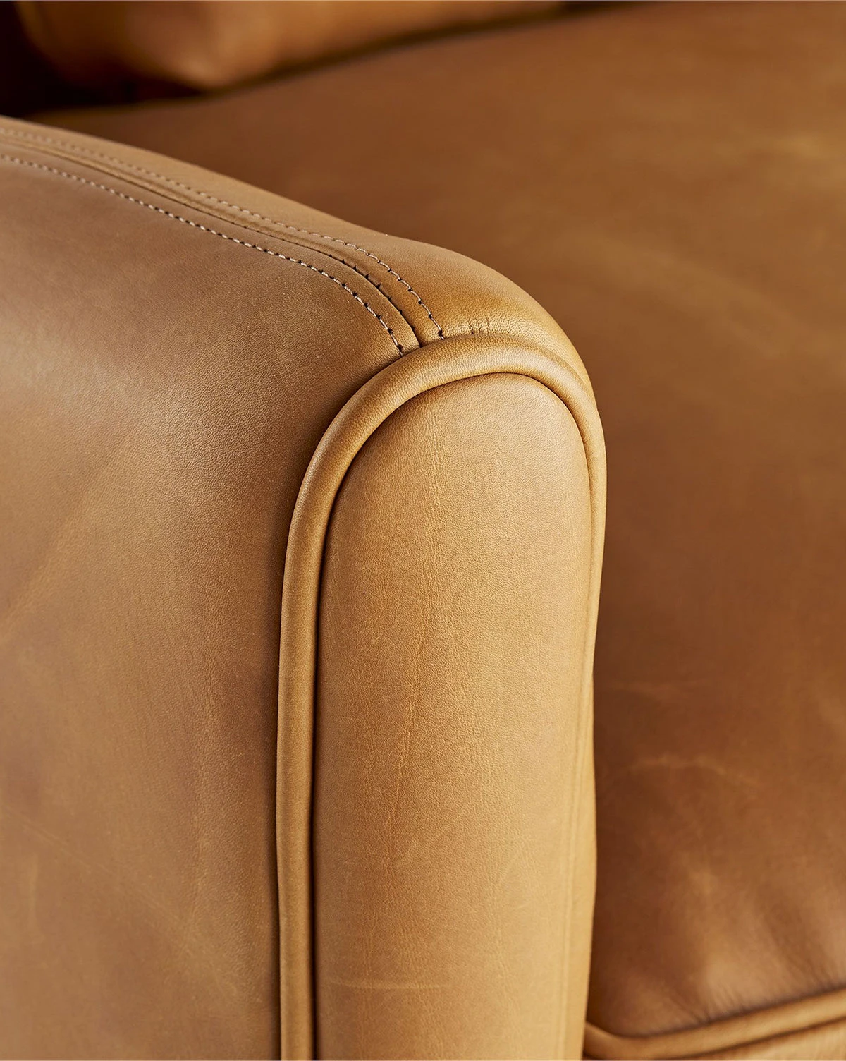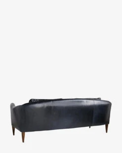 Influenced by Parisian style, this vintage-inspired settee features detailed welting accentuating its curves. Tapered maple wood legs add a modern aesthetic to the design, as two small cushions atop the couch bring a sophisticated imbalance.