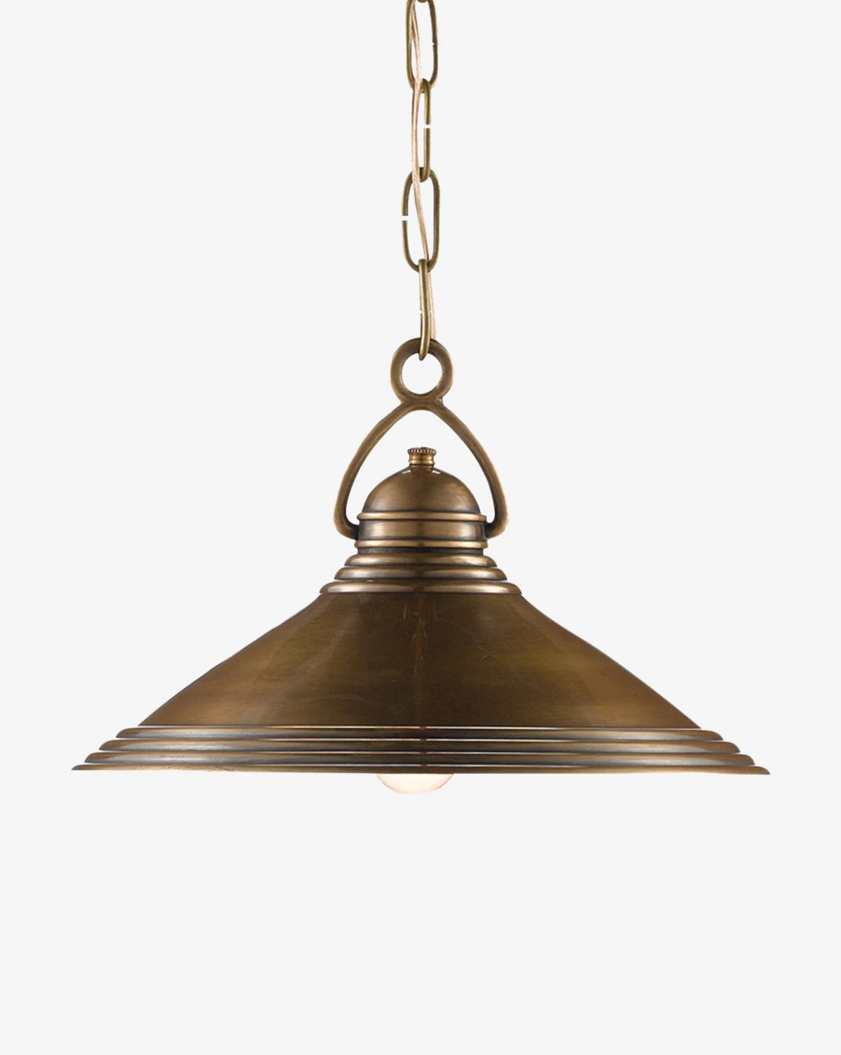 Inspired by vintage industrial style, the Weybright Pendant is made from brass and finished with a vintage look. From the hook that fastens the fixture to the chain and the ribbed details on the shade, this fixture exudes old-world elegance.