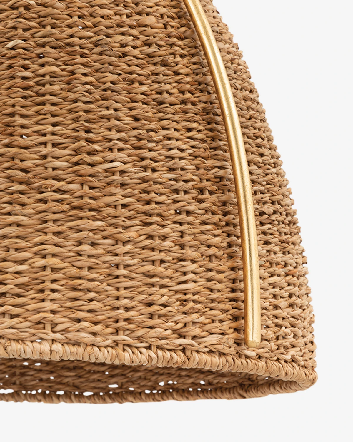 Crafted with intricate detail, the Woodlawn Pendant brings organic texture and elevated design to your space. An intricately woven shade of Lampakanai rope hangs from an elegant stem-and-loop chain of gold leaf finished metal. With a steep domed shape, the pendant brings warm light to an open room.