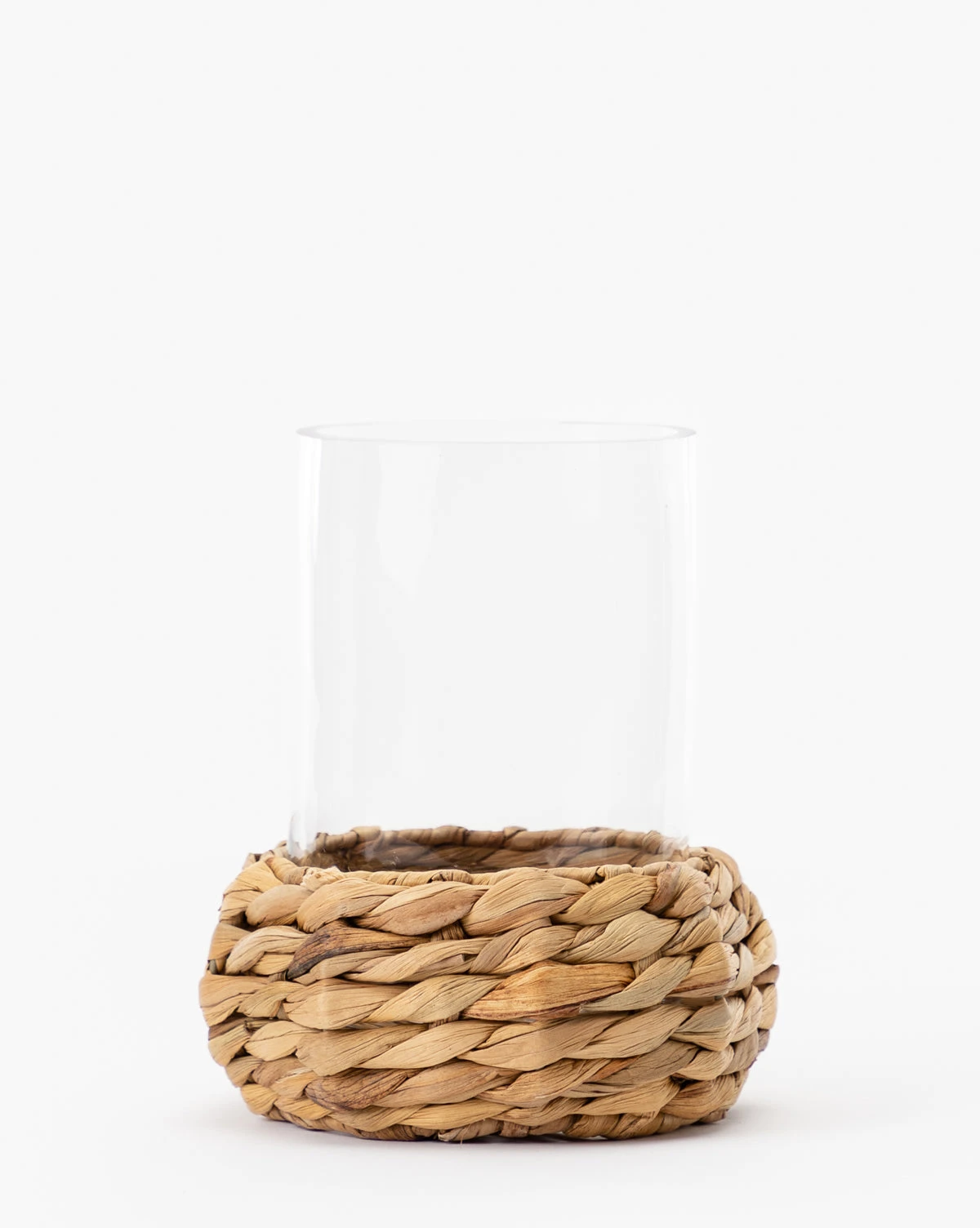 Bring light into your space with the organic Woven Hurricane. Crafted from woven natural materials and glass, the ideal mix of materials in this votive lends subtle texture and detail to your candle displays from countertops to console vignettes.