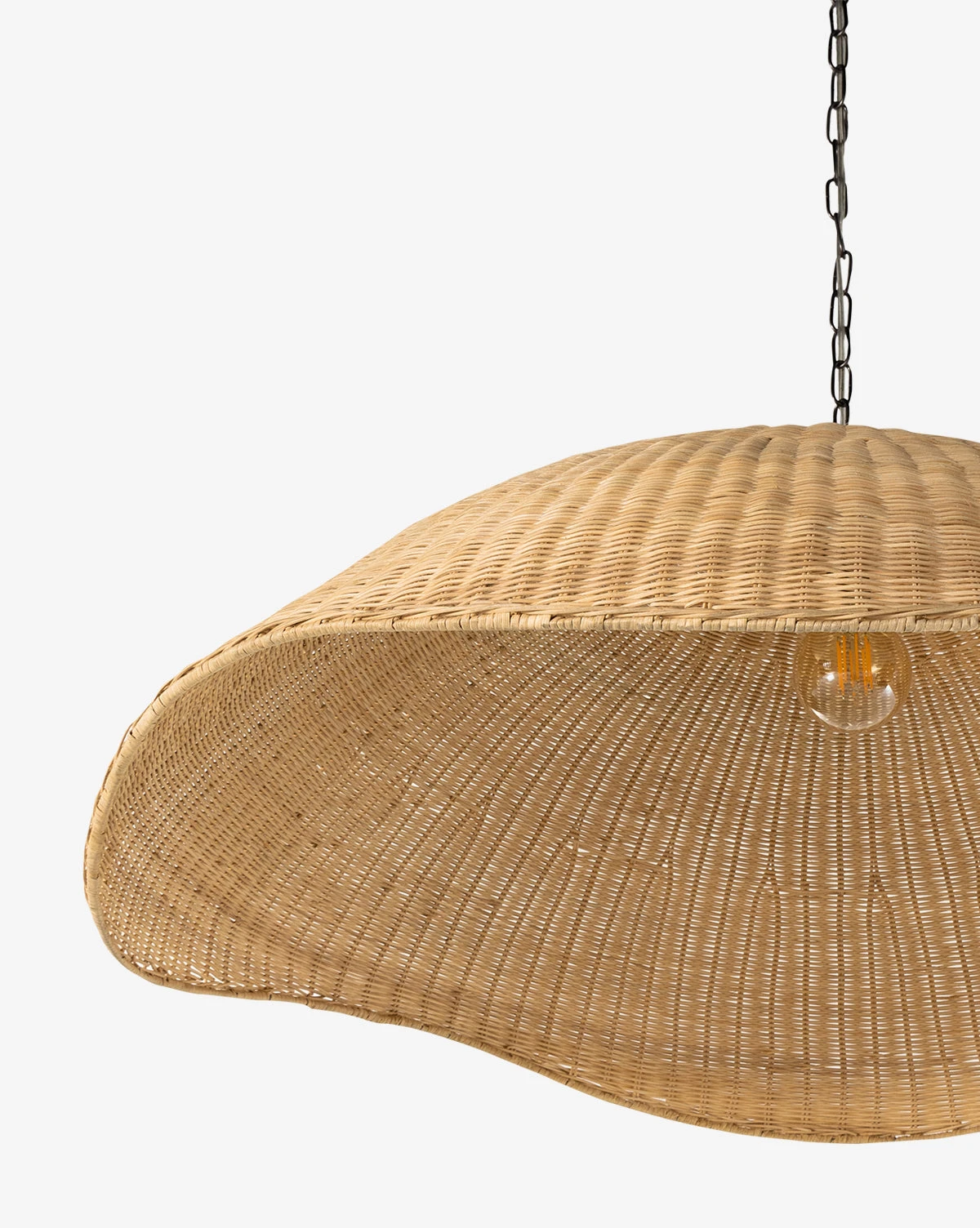 Featuring a shapely and organic shell-like shade woven from natural rattan, the Woven Rattan Pendant is suspended from a gunmetal-finished iron chain. Seamlessly blending modern design with textural materials, this pendant brings warm light to your home.