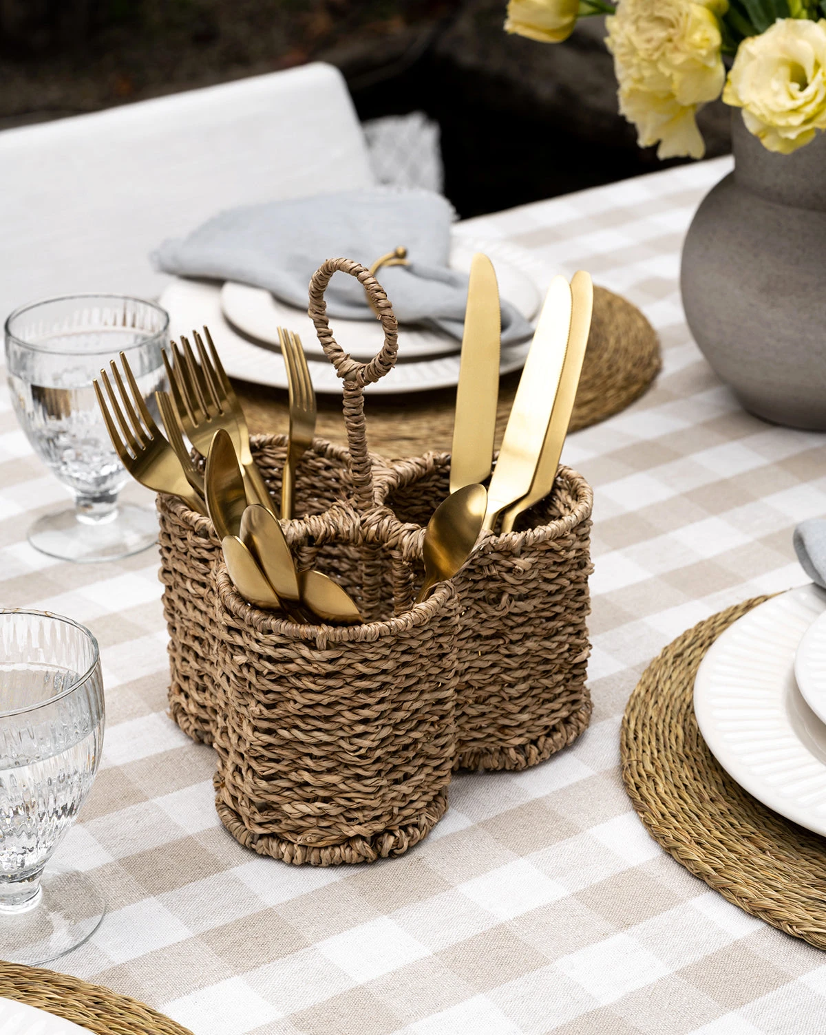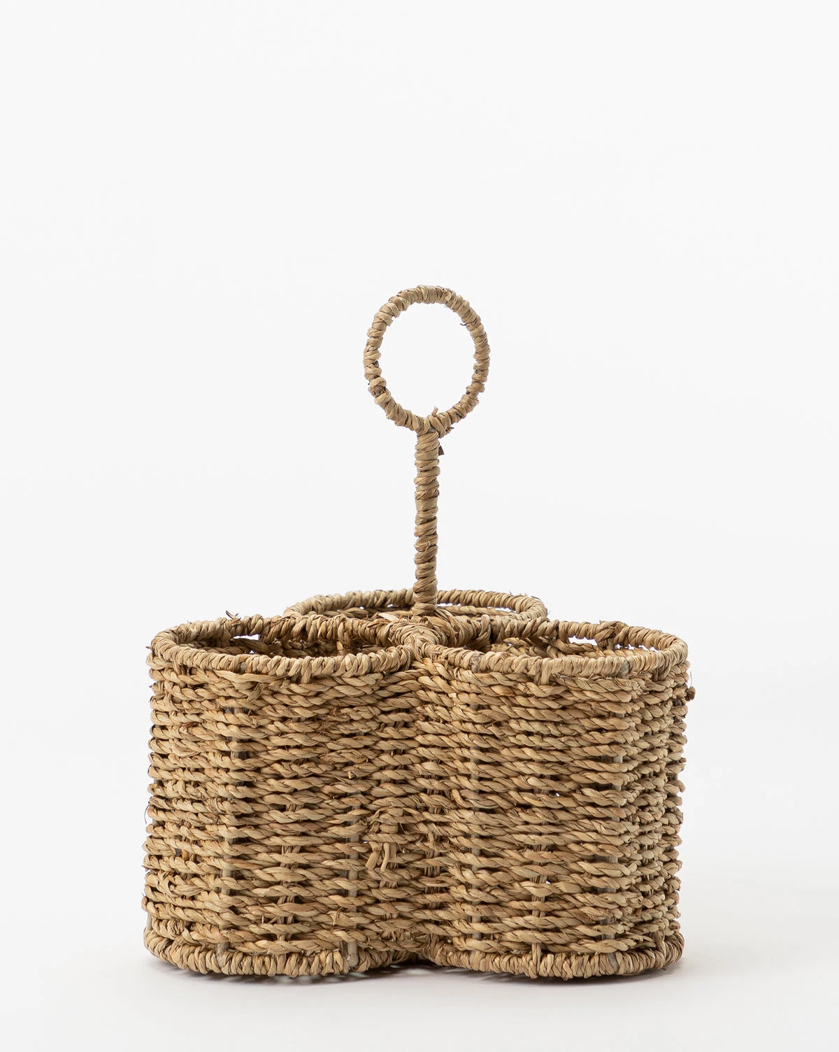 Cheerful and charming, the Woven Utensil Caddy adds a playful element to get-togethers and gatherings. Handwoven from seagrass with three sections perfect for entertaining, this practical piece adds a casual warmth and welcome to the table.