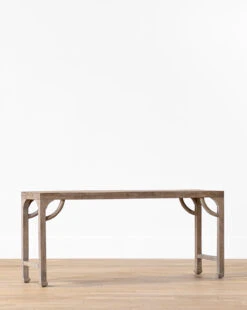 The Youngman Console Table has unique architectural details that bring a rustic playfulness to your space. Inspired by a traditional console, the Youngman Console Table uses small archways in its interior corners as a refreshing update to this timeless piece. Its wood frame is finished with light gray undertones, which adds versatility and depth to its aesthetic.