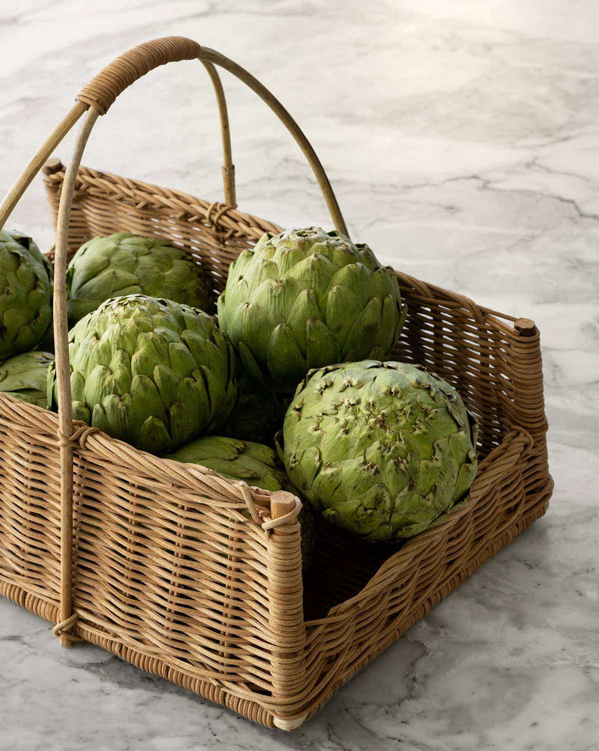Intricate and open, the Zora Rattan Basket is handwoven from rattan. Each element of this basket is intentional, making it the perfect addition to a functional kitchen countertop vignette or entryway styling with seasonal greenery.